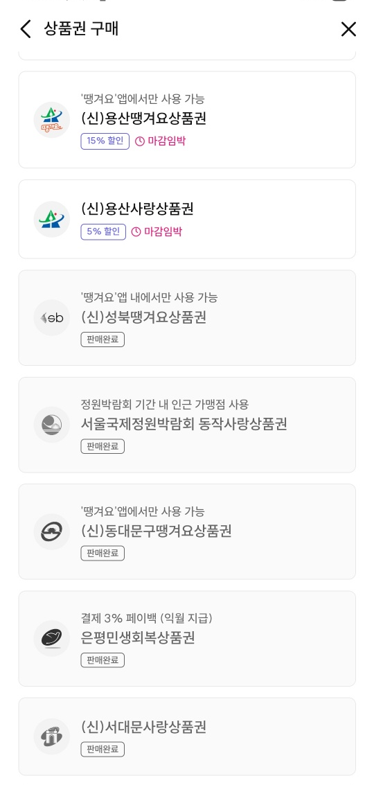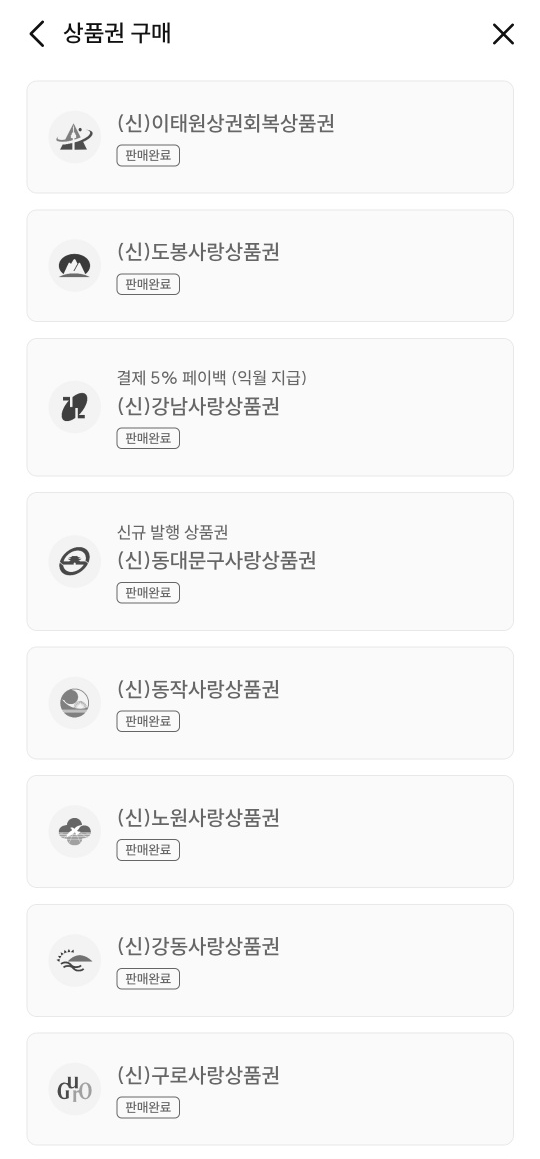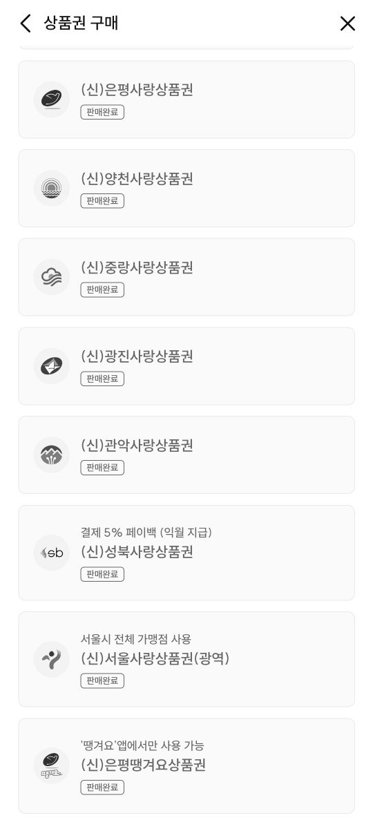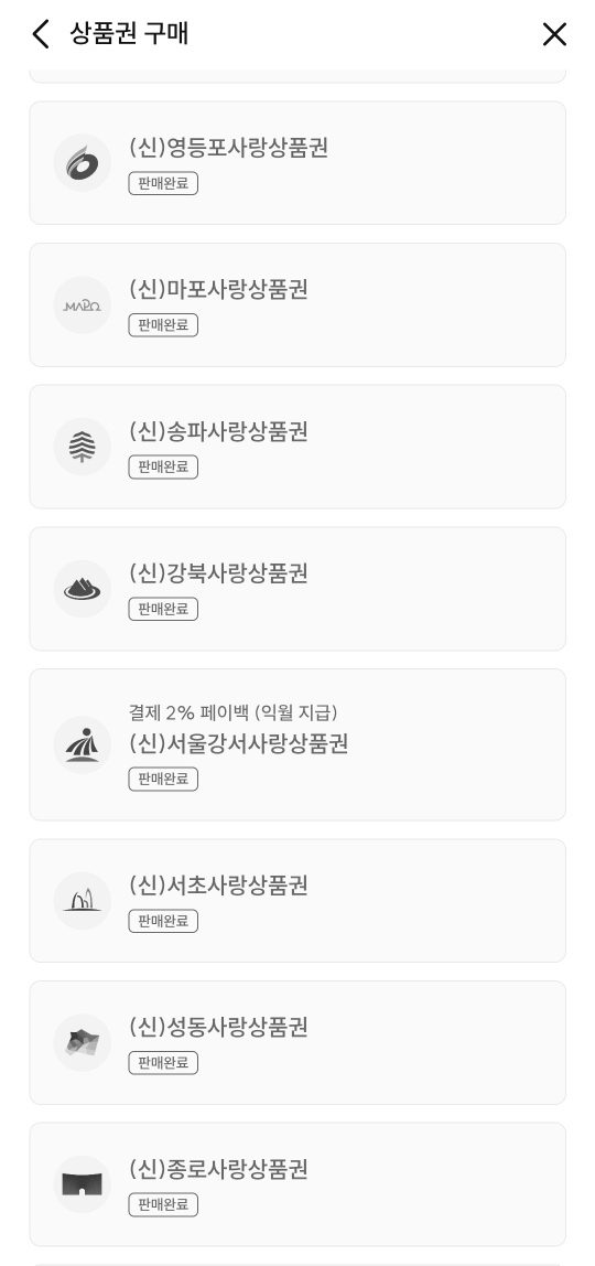 | 서울 25개 자치구 지역상품권 종로, 중구, 용산, 성동, 광진, 동대문, 중랑, 성북, 강북, 도봉, 노원, 은평, 서대문, 마포, 양천, 강서, 구로, 금천, 영등포, 동작, 관악, 서초, 강남, 송파, 강동 |