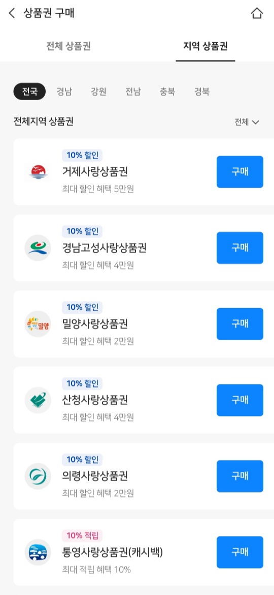| 지역 | 상품권 이름 | 기본 할인율/캐시백 | 적용 조건 | 추가 혜택 |